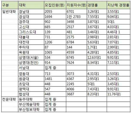이에 따라 △상명대(서울)는 9.91대1에서 12.63대 1 △영동대는 2.53대 1에서 4.31대 1 △초당대는 3.45대 1에서 5대 1로 지난해 수시모집에 비해 경쟁률이 상승했다. 이들 대학들은 수시모집에서 선방할 수 있었던 핵심 이유로 ‘자구 노력’을 꼽았다.