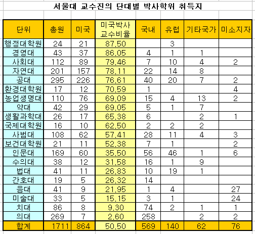 서울대 1천7백11명의 교수 중 약 50%인 8백64명의 교수가 미국에서 박사학위를 받은 것으로 나타났다.