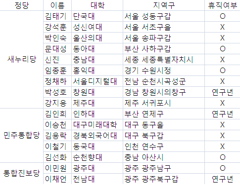 이번 4·11총선에 후보로 주요 3당의 공천을 받은 현직 교수는 김태기 단국대·강석훈 성신여대·박인숙 울산의대·문대성 동아대·신진 충남대·임종훈 홍익대·정채하 서울디지털대·박성호 창원대·강지용 제주대(이하 새누리당)·김인회 인하대·이승천 대구미래대학·김용락 경북외국어대·이철기 동국대·김선화 순천향대(이하 민주통합당)·이민원 광주대·이채언 전남대 교수(이하 통합진보당) 등 모두 16명이다.(비례대표 제외)