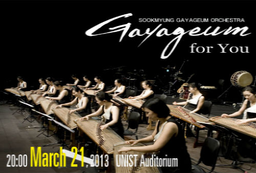 UNIST(총장 조무제)는 이날 저녁 8시 대학본부 2층 대강당에서 숙명가야금연주단의 ‘가야금 포유’(Gayageum For You) 초청 공연을 마련한다고 19일 밝혔다.