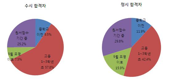 또 전공 및 진로를 결정한 시기는 수시, 정시 합격생 모두 고등학교 1학년에서 3학년 초라고 답한 경우가 가장 많았다.