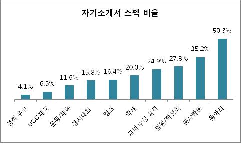 수험생들이 자기소개서에 기록한 스펙을 분석한 결과, 동아리 활동이 50.3%(1861명)로 가장 많았다. 그 다음으로는 △봉사활동 35.2%(1301명) △학생회ㆍ임원 활동 27.3%(1012명) △교내 수상 실적 24.9%(923명) △축제 경험 20%(742명) △캠프 경험 16.4%(608명) △경시대회 수상 15.8%(584명) △운동ㆍ체육대회 참여 11.6%(431명) △UCC제작 6.5%(240명) △성적우수ㆍ상승 4.1%(151명) 순으로 나타났다.