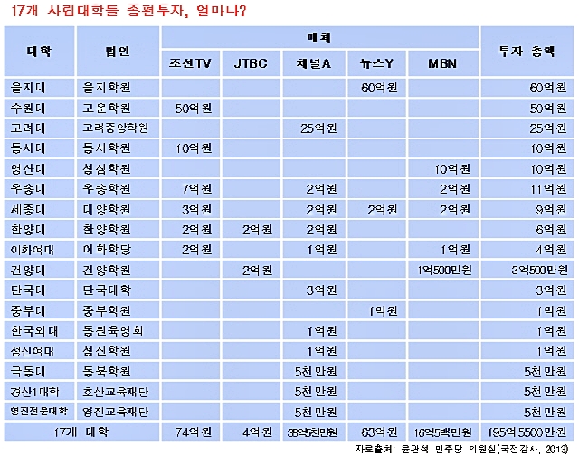 이 같은 사실은 14일 국회 교육문화체육관광위원회 국정감사에서 윤관석 민주당 의원으로부터 제기됐다. 윤 의원에 따르면 을지대 법인 을지학원이 뉴스Y에 60억원을 투자해 최고 투자액수를 기록했다. 수원대 법인 고운학원은 조선TV에 50억원을, 고려대 법인 고려중앙학원은 채널A에 25억원을 투자했다. 우송대(11억원)·동서대·영산대(각 10억원) 법인들도 종편에 10억원대 투자를 한 것으로 나타났다.