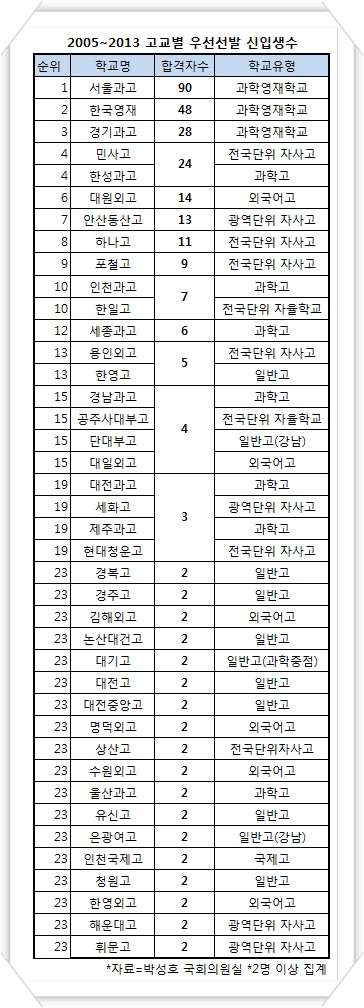 고교별 서울대 우선선발 신입생 톱3는 과학영재학교가 나란히 차지했다. 서울과학고가 90명으로 2위 한국영재고 48명의 두 배에 육박했다. 경기과학고는 28명으로 3위에 자리했다. 이어 민족사관고등학교, 한성과학고 4위(이상 24명), 대원외고 6위(14명), 안산동산고 7위(13명), 하나고 8위(11명), 포철고 9위(9명), 인천과학고, 한일고 10위(이상 7명) 순이었다.