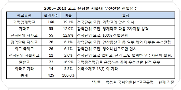 고교 유형별 서울대 우선선발 신입생수는 과학영재학교 166명(39.1%), 과학고 · 전국단위 자사고 이상 각 55명(12.9%), 광역단위 자사고·외고/국제고 이상 각 26명(6.1%), 전국단위 자율학교 11명(2.6%) 순이었다. 일반고는 72명으로 전체의 16.9%를 차지했다. 자연계열 고교가 막강 경쟁력을 보인 가운데 인문계열 최고 명문인 외고와 국제고는 실적이 미미해 대조적이다.