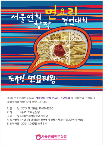 요리 특성화 전문학교인 서울연희전문학교(서연전)의 호텔조리학과와 제과제빵학과 측은 오는 29일 ‘제 1회 서울연희 창작 면요리 경연대회’를 개최한다고 14일 밝혔다.
