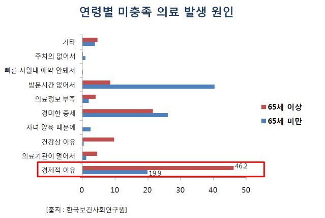 젊고 건강할 때는 모르지만 나이가 들수록 깨닫는 것이 있다. 바로 병원비의 무서움이다. 나이가 들수록 병원 방문 횟수도 빈번해지고 더 많은 병원비가 청구되기 때문이다. 한국보건사회연구원의 통계에 따르면 적절한 진료를 받지 못하는 ‘미충족 의료 발생 원인’중 65세 미만 인구는 5명중 1명이, 65세 이상 인구는 2명 중 1명이 경제적인 이유라고 답변했다.