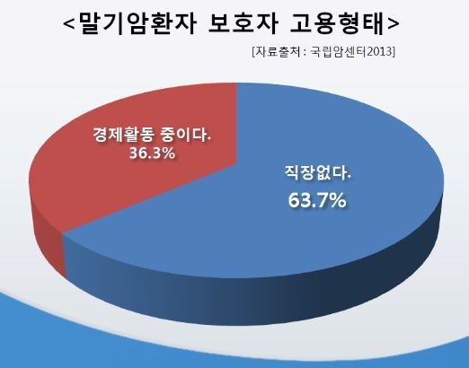 암에 걸릴 경우 경제적인 문제는 비단 암치료비만이 아니다. 암환자 본인이 경제활동이 불가능한것은 물론 암환자의 보호자까지 직장생활이 어렵기 때문이다. 국립암센터 조사에 따르면 암환자의 보호자 10명 중 7명은 간병을 위해 직장을 포기하는 것으로 나타났다.