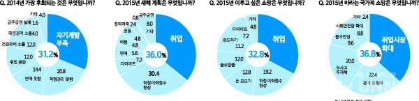 응답자들이 2015년에 이루고 싶은 개인적 소망도 다르지 않았다. ‘취업’(32.8%)과 ‘학점 및 어학점수향상’(19.2%)이 각각 1위와 2위에 올랐고 다음으로 ‘돈 모으기’(12.8%), ‘솔로탈출’(12%), ‘부모님께 효도하기’(11.2%), ‘다이어트(7.2%)' 순이었다.