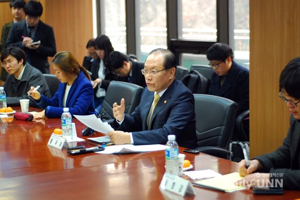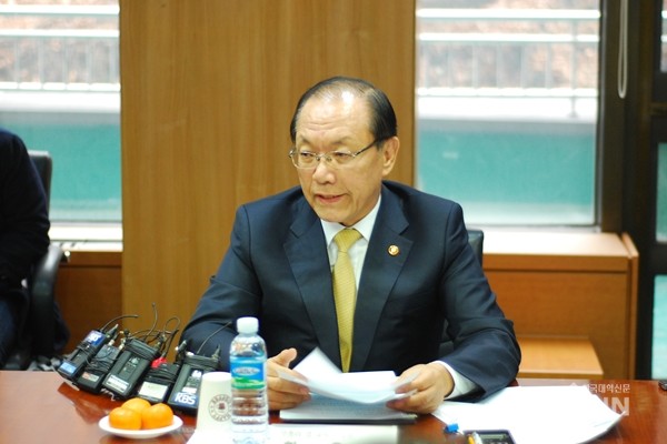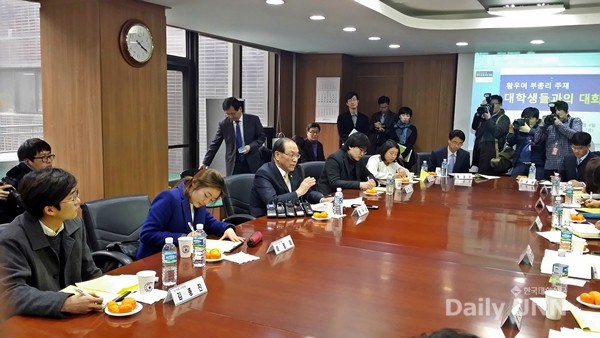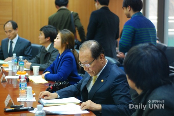 [한국대학신문 이재익 기자] 황우여 사회부총리 겸 교육부 장관이 4일 한국교육개발원에서 대학생들과 간담회를 가졌다. 황 부총리는 대졸자와 사회적 수요의 미스매치 문제를 언급하며 현재 청년층의 취업문제에 대한 심각성을 강조했다. 황 부총리는 “학생 여러분이 대학정책에 대해 그동안 하고 싶은 말이 얼마나 많았겠느냐. 기탄없이 이야기 해주시고 나도 장관으로서 애로사항을 솔직하게 말씀드리겠다”고 말했다. 모두발언하고 있는 황 부총리(맨위). 옆에 앉은 학생의 의견을 경청하고 있는 황 부총리(세번째).