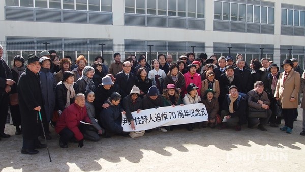 이날 19명의 한국 문인‧교수들은 후쿠오카에서 윤동주 타계 70주기를 맞아 추모식을 가졌다. 이날 행사는 일본 시민모임인 ‘후쿠오카 윤동주 시를 읽는 모임’이 함께 했다. 이들은 공원에서 시인의 영정에 헌화하고 대표 시들을 낭송했다.