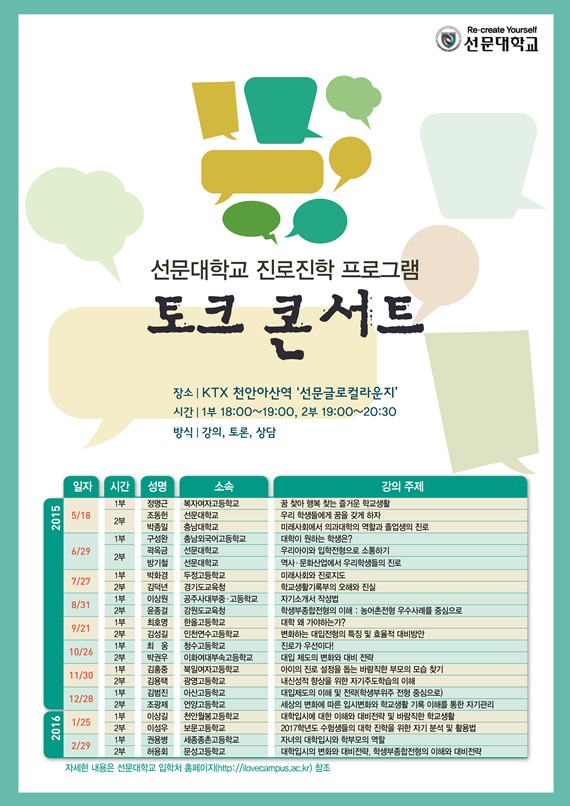 첫 토크콘서트는 18일(오후 6시부터 8시 30분까지)에 정명근 교사(복자여자고등학교)의 ‘꿈 찾아 행복 찾는 즐거운 학교생활’, 조동헌 교수(선문대)의 ‘우리 학생들에게 꿈을 갖게 하자’, 박종일 교수(충남대)의 ‘미래사회에서 의과대학의 역할과 졸업생의 진로’라는 주제로 진행될 예정이다.