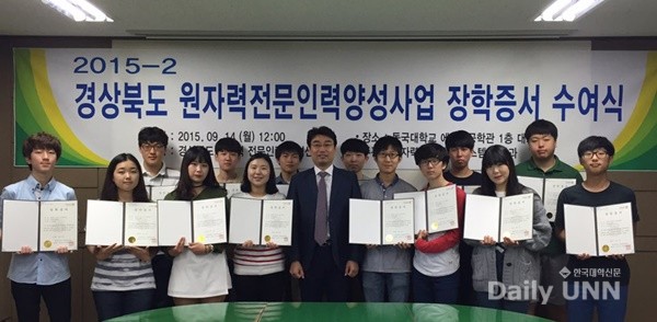 이번 장학금 수여는 원자력전문인력양성을 위한 것으로, 동국대 경주캠퍼스는 2014년부터 2016년까지 경상북도가 추진 중인 원자력 클러스터 조성사업 중 하나인 원자력인력양성사업 2단계 사업에 선정돼 총 12억원의 사업비를 지원받고 있다.