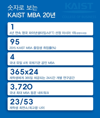 1 _ 4년 연속 FT 선정 아시아 1위 = KAIST MBA는 2011년 영국 파이낸셜타임스(FT)‘ 글로벌 100대 MBA'에 진입한 국내 첫 전일제 MBA로도 주목 받았으며, 2012년 이후 4년 연속 FT의 ‘경영자과정(Executive Education) 경영대학원 순위’ 아시아 1위를 기록 중이다(2015년 기준 세계 20위).