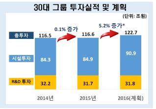 삼성그룹은 평택 반도체단지 건설에 15조6000억원을 투자한다. 이를 위해 지난해부터 2018년까지 1단계로 15조6000억원이 집행된다. 현대차그룹도 같은 기간 친환경 및 스마트 차량 개발에 2018년까지 13조3000억원을 투자한다.