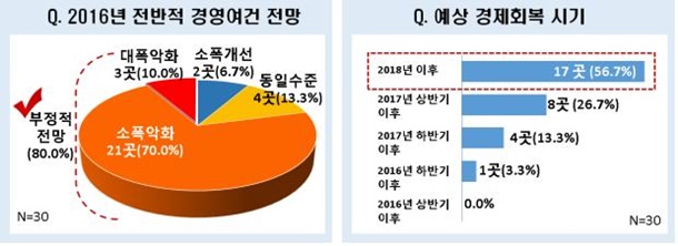 한편 30대 그룹을 상대로 실시한 설문조사 결과 80%의 기업들이 올해의 전반적인 경영 여건이 악화할 것으로 봤다. 어려운 대내외 경영 환경을 극복하기 위한 중점 전략으로는 사업 구조조정 등 경영 내실화(70.1%)를 가장 많이 꼽았다.