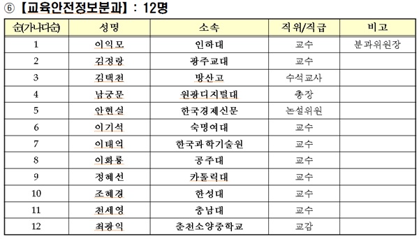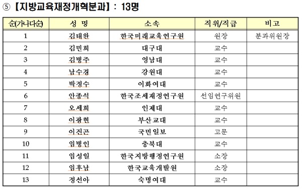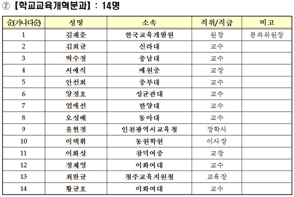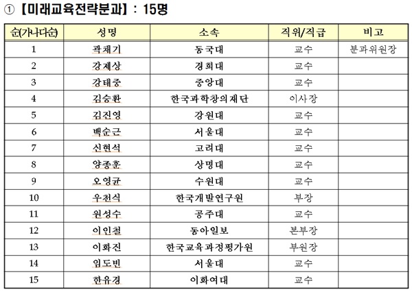 개별 분과로는 ‘미래교육전략분과(위원장 곽채기 동국대 교수)’, ‘학교교육개혁분과(위원장 김재춘 전 차관 겸 한국교육개발원장)’, ‘대학교육개혁분과(위원장 백성기 대학구조개혁위원장)’, ‘평생직업교육분과(위원장 나승일 전 차관 겸 서울대 교수)’, ‘지방교육재정개혁분과(위원장 김태완 한국미래교육연구원장)’, ‘교육안전정보분과(위원장 이익모 인하대 교수)’, ‘국제협력분과(위원장 한경구 서울대 교수)’ 등 7개로 나뉜다.