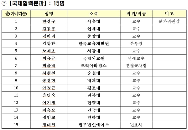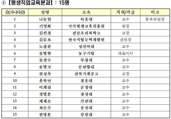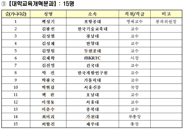 각 자문위원은 교육부 관련 실·국에서 추천한 전문가들로 구성됐다. 대학교육개혁분과는 백성기 대학구조개혁위원장(포스텍 전 총장)을 필두로 허향진 차기 한국대학교육협의회장(제주대 총장), 최미리 가천대 부총장, 김광선 한국기술교육대 교수, 김성열 경남대 교수, 김성제 한양대 교수, 김영일 두원공과대학 교수, 김진영 건국대 교수, 박진 한국개발연구원(KDI) 교수, 백란 호남대 교수, 이정동 서울대 교수, 이춘수 충북대 교수가 포함됐다. 철도 기술 엔지니어링 기업인 (주)KRTC의 김재학 사장도 자문위원으로 위촉됐다.
