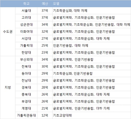 대학별로는 종합모델에서 서울대와 고려대가 37억원으로 가장 많았으며 성균관대와 부산외대는 34억원, 이화여대 32억원, 전북대 30억원, 동아대와 전남대가 29억원, 경북대 28억원, 부경대와 충북대 26억원, 가톨릭대 25억원, 한양대 23억원, 계명대 21억원이다. 기초교양대학모델에서 가톨릭관동대는 당초 최소 지원금액인 5억원의 2배 이상인 12억원을 신청해 그대로 지원받게 됐다.
