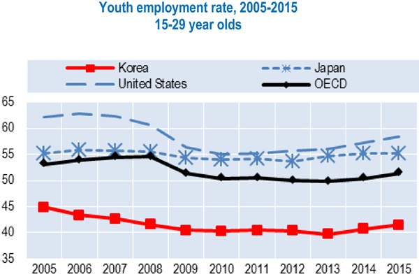 13일 OECD가 발표한 ‘한눈에 보는 사회(Society at a Glanace 2016)’에 따르면 한국 청년 가운데 니트비율은 18%로 OECD 평균 16%보다 2%P 높았다. 청넌고용률은 2015년 42%로 OECD 평균 51에 비해 9%P 낮았다. OECD는 한국 청년고용률은 지난 10년간 4%P 하락했고, 이는 OECD 평균 3.3%보다 높은 수준이라고 분석했다.