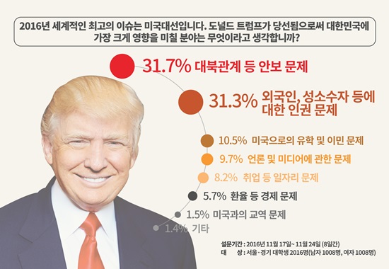 ‘2016년 미국 대선 결과가 대한민국에 미칠 영향은 무엇인가’라는 질문에는 31.7%로 ‘대북관계 등 안보 문제’가 1위를 차지했고 이어 △외국인, 성 소수자 등 인권 문제(31.3%) △미국으로의 유학 및 이민 문제(10.5%) △취업 등 일자리 문제(8.2%) △환율 등 경제 문제(5.7%) △미국과의 교역 문제(1.5%) 등으로 나타났다.
