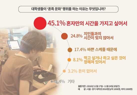 ‘혼족 문화’가 확산되는 이유로는 ‘바쁜 대학 생활’이 34.5%로 1위 △관계 유지에 대한 부담감(22.9%) △1인 가구의 확대(21.5%) △개인주의 팽배(14.8%) △SNS 과시욕(1.4%) 등으로 나타났다.