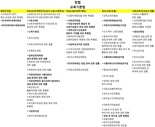 교육기본법을 정점으로 공교육 체계를 규정하고 있는 게 유아교육법과 초·중등교육법, 고등교육법 등 학교 3법이다. 이들 법률은 각각 미취학 아동교육기관과 초등~고등학교, 대학 등 공교육기관에서 헌법의 교육 개념이 적용될 수 있도록 마련된 법률이다. 이밖에도 평생교육법, 사립학교법, 교육공무원법 등 기관과 교육주체별 적용 법률이 따로 마련돼 있는 게 국내 교육법 체계다.