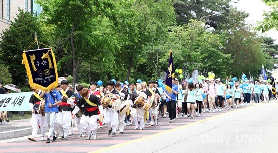 교류전은 한림대 정문에서 강원대 종합운동장까지 퍼레이드로 막을 올렸다. 양 학교 학생들은 자신의 소속 학교 총장 등 관계자 이름이 호명될 때마다 환호성을 지르며 기 싸움을 했다.
