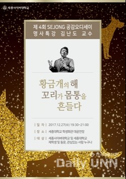 [한국대학신문 황정일 기자] 세종대·세종사이버대(총장 신구)는 오는 27일 오후 7시 30분 《아프니까 청춘이다》의 저자로 유명한 김난도 서울대 교수가 ‘제4회 세종 공감오디세이’ 문화 콘서트에서 ‘트렌드 코리아 2018 황금 개의 해, 꼬리가 몸통을 흔들다’라는 주제로 특강을 한다고 밝혔다.