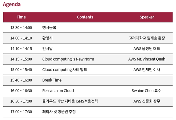 이날 클라우드 컴퓨팅 분야 전문가들의 발표가 예정돼있다. 빈센트 큐사(Vincent Qusah) 아마존 웹서비스(AWS) 아시아-태평양 교육총괄 부사장이 클라우드 컴퓨팅 트렌드를 소개한다. 이어 전제민 AWS 이사가 클라우드 컴퓨팅 사례를 발표하고, 세계 100개 대학의 적용 사례를 공유한다. 신종회 AWS 상무는 '클라우드 기반 저비용 ISMS 적용전략'이라는 주제로 대학의 ISMS 인증을 위한 고려사항을 안내한다. 스웨인 첸(Swaine Chen) 싱가포르대 교수는 싱가포르 대학의 클라우드 컴퓨팅 연구 분야 적용 사례를 발표한다.