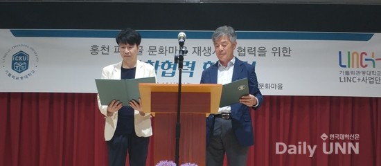 [한국대학신문 이하은 기자] 가톨릭관동대 LINC+사업단과 강원도 홍천 피리골은 지난 16일 문화마을재생사업을 위한 산학협력 협약을 체결했다.