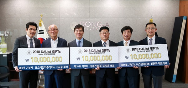 [한국대학신문 김준환 기자] 동아대(총장 한정석) 경영대학의 발전기금 릴레이 프로젝트인 ‘다우이스트 기프트(DAUist Gift)’ 9~11호 주자가 한꺼번에 나왔다.