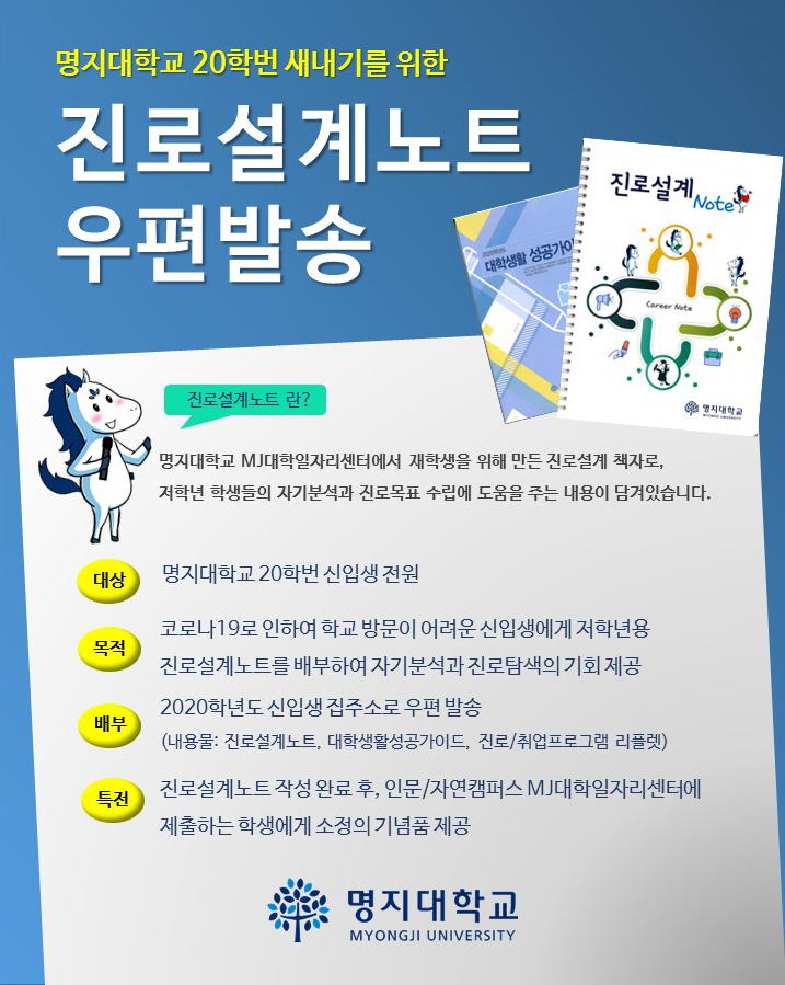 [한국대학신문 조영은 기자] 명지대학교(총장 유병진) 대학일자리센터가 2020학년도 신입생의 진로설계를 돕고자 ‘진로설계 노트’를 제작했다. 코로나19로 인해 2020학년도 1학기가 온라인수업으로 진행됨에 따라 20학번 신입생을 대상으로 진로탐색에 도움이 되는 ‘진로설계 노트’를 우편으로 발송하며 신입생의 진로설계를 적극적으로 지원했다.