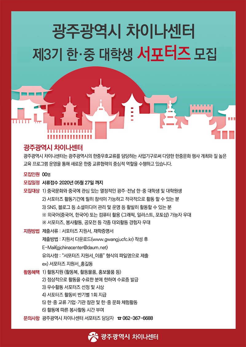 [한국대학신문 이다솜 기자] 광주광역시 차이나센터(센터장 조경완 호남대 교수)가 27일까지 중국 문화와 중국에 관심 있는 대학(원)생을 대상으로 ‘제 3기 한·중 대학생 서포터즈’를 모집한다.