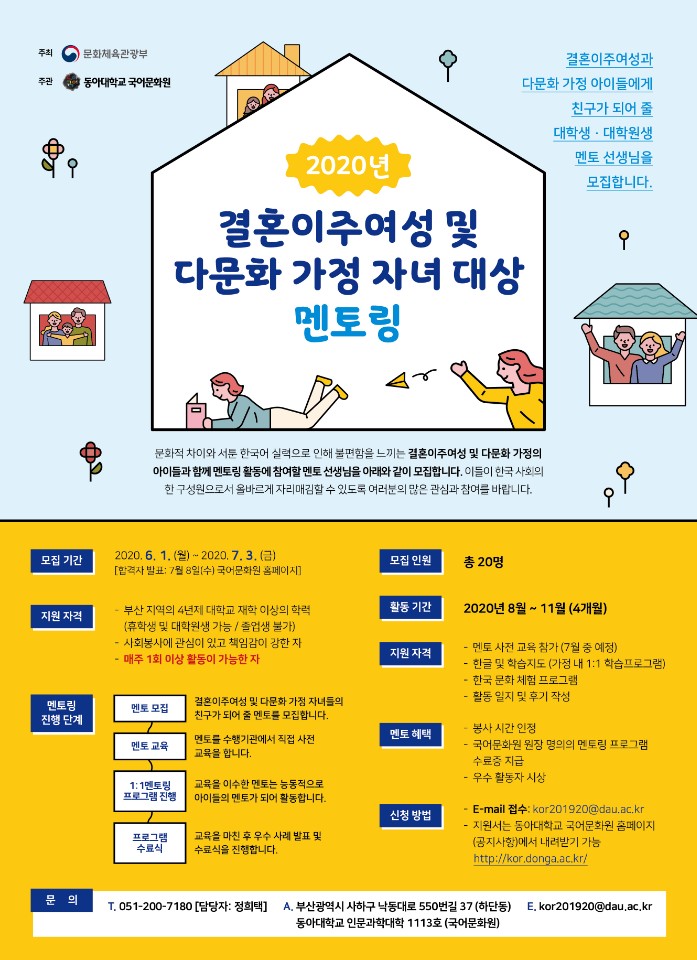 [한국대학신문 이다솜 기자] 동아대학교(총장 한석정) 국어문화원(원장 김영선)은 대학생과 일반인이 참여할 수 있는 ‘2020학년도 제31기 한국어교원 양성과정’과 ‘2020년 결혼이주여성 및 다문화 가정 자녀 대상 멘토링’ 참가자를 모집한다.