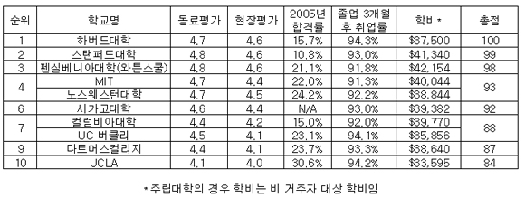 매사추세츠공학대학(MIT), 노스웨스턴대학, 시카고대학, 콜럼비아대학, 캘리포니아대학 버클리캠퍼스, 다트머스컬리지, 캘리포니아대학 LA캠퍼스 등이 10위권에 들었다.