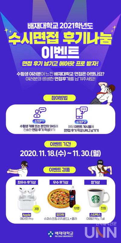 [한국대학신문 백수현 기자] 배재대학교(총장 김선재)가 30일까지 대입 수시모집 면접‧실기고사에 참여하고 후기를 작성한 수험생에게 에어팟 프로 등을 증정하는 이벤트를 진행한다. 대상은 배재대 2021학년도 대입 수시모집에 지원해 면접‧실기고사를 치른 수험생이다.