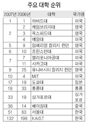 우리 대학 중에서는 서울대가 지난해 63위에서 올해 51위로 열두계단 뛰어올랐고 지난해 198위로 200위권에 턱걸이했던 KAIST는 132위를 차지했으나 각각 50위권, 100위권 진입에는 실패했다.