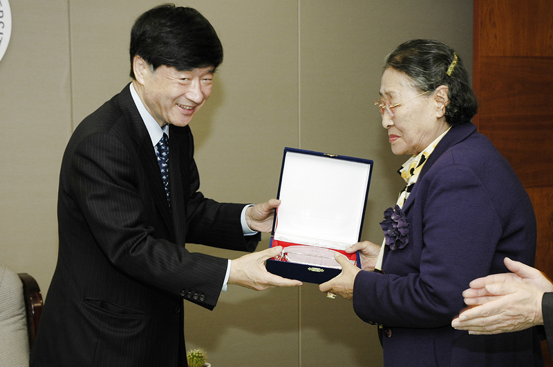 장 여사는 10일 오후 총장실을 방문, 서정돈 총장에게 유물을 전달하고 기증식을 가졌다.
