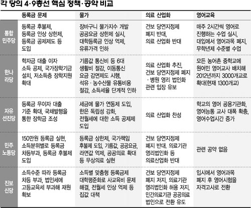 고교 졸업자 80% 이상이 대학에 진학하는 현실에서 ‘등록금 1000만원’ 문제는 각 정당간의 가장 뚜렷한 체감 쟁점 중 하나다. 주요 정당들은 등록금 인상률이 소비자물가 상승률(3% 내외)의 3배에 달하는 것은 심각한 문제라는 데 공감하면서도 제시한 해법은 큰 차이를 보였다.