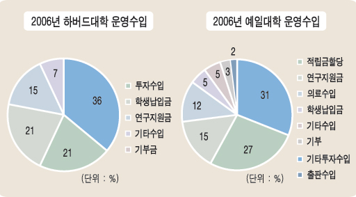 2006년 운영수입 중 투자수입(기부자산 운영)은 무려 36%를 차지했다. 정부에서 지원하는 연구지원금 수입은 21%에 달했고, 등록금은 전체 21%였다.