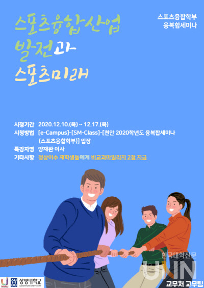 [한국대학신문 백수현 기자] 상명대학교(총장 백웅기) 2캠퍼스(천안) 스포츠융합학부(학부장 정동화)는 대학혁신지원사업의 일환으로 10일 ‘온라인 융복합 세미나’를 개최한다. 세미나의 주제는 ‘스포츠융합산업 발전과 스포츠 미래’이다.