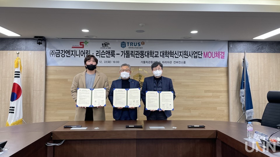 [한국대학신문 이원지 기자] 가톨릭관동대학교(총장 황창희) 대학혁신지원사업단은 22일 박용진 ㈜금강엔지니어링 관리이사, 최승호 리슨앤룩 대표와 ‘소프트웨어 융합사업 및 교육지원을 위한 MOU’를 체결했다고 24일 밝혔다.