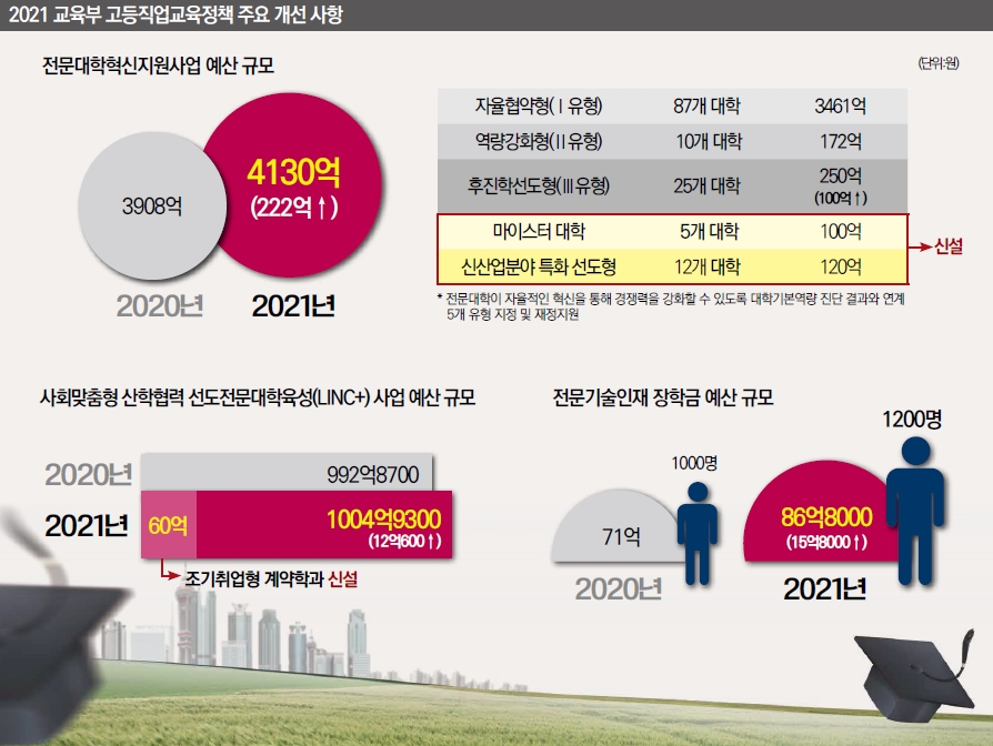 [한국대학신문 김의진 기자] 신축년(辛丑年) 새해가 밝았다. 올해 교육부의 고등직업교육 정책은 전문대 역량을 극대화하기 위한 지원제도에 중점을 둔다. 전문대의 새로운 방향을 제시하고, 전문대 학생에 대한 교육·취업 지원을 강화하겠다는 취지에서다. 전문대학혁신지원사업에 ‘마이스터대’와 ‘신산업 분야 특화 선도형’이 새로운 유형으로 추가되고, 우수 전문대 학생에게 장학금을 지급하는 ‘전문기술인재장학금’은 수혜학생 수가 더 늘어난다. 지난해까지 일반대에만 지원됐던 ‘조기취업형 계약학과’ 사업은 올해부터 전문대에도 적용·확대될 예정이다.