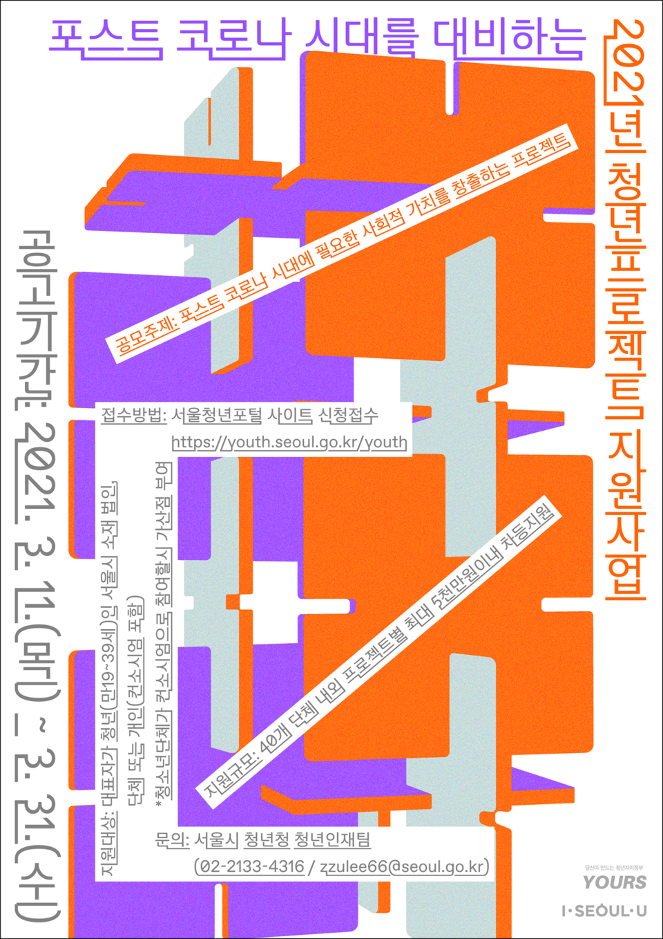 참여를 원하는 청년단체‧기업‧개인은 서울청년포털(https://youth.seoul.go.kr/youth)을 통해 31일까지 신청접수하면 된다. 문의사항은 서울시 청년청 청년인재팀(02-2133-4316, zzulee66@seoul.go.kr)으로 하면 된다.