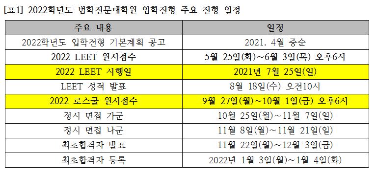 2022학년도 법학적성시험(LEET)은 7월 25일에 실시하며 원서접수 기간은 5월 25일부터 6월 3일 오후6시까지다.