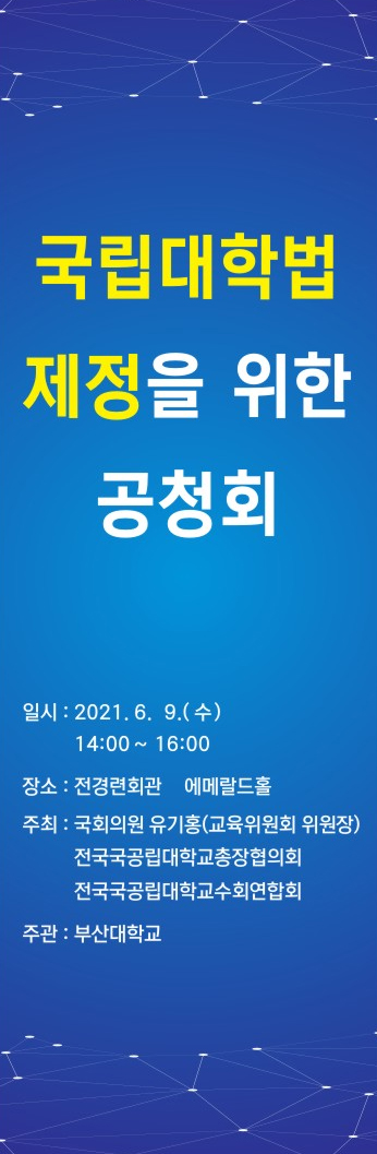 [한국대학신문 허정윤 기자] 유기홍 국회 교육위원회 의원(국회 교육위원장)과 전국국공립대학총장협의회(회장 김수갑 충북대 총장) 및 전국국공립대학교교수회연합회(상임회장 오홍식 제주대 교수회장)가 공동주최하는 ‘국립대학법 제정 공청회’가 오는 9일 오후 2시부터 4시까지 서울 여의도 전경련회관 에메랄드홀에서 개최될 예정이다.