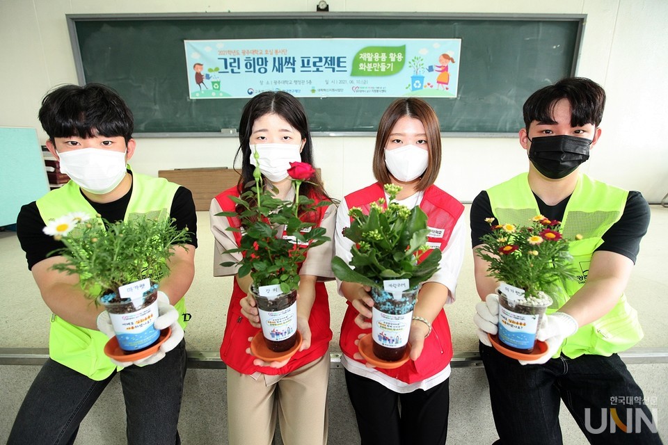 ‘그린 희망 새싹 프로젝트-재활용품 활용 화분 만들기’는 저탄소 배출·환경보호 캠페인 홍보와 대학 주변 상권 소상공인 코로나19 극복을 응원하기 위해 추진됐다.