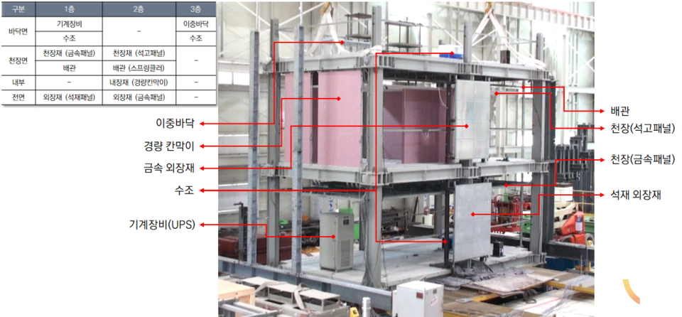 실제 3층 크기의 건축물 1층에는 내진설계된 기계장비·수조·천장재(금속패널)·배관·외장재(석재패널)를 설치하고, 2층은 천장재(석고패널)·배관(스프링클러)·내장재(경량칸막이)·외장재(금속패널)를, 3층은 이중바닥과 수조를 넣었다.