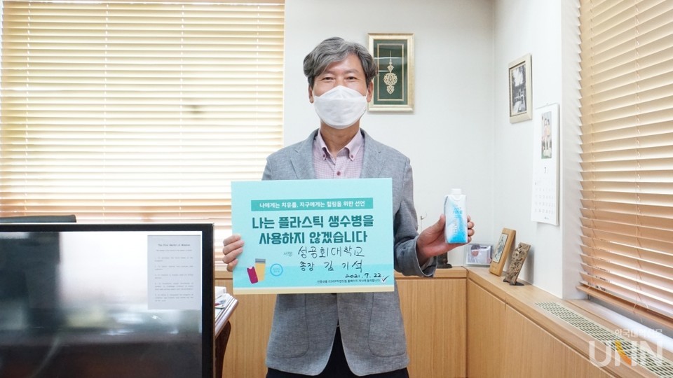 김 총장은 26일 성공회대 공식 SNS를 통해 “나는 플라스틱 생수병을 사용하지 않겠습니다”라는 약속이 담긴 팻말을 든 사진을 공개했다.